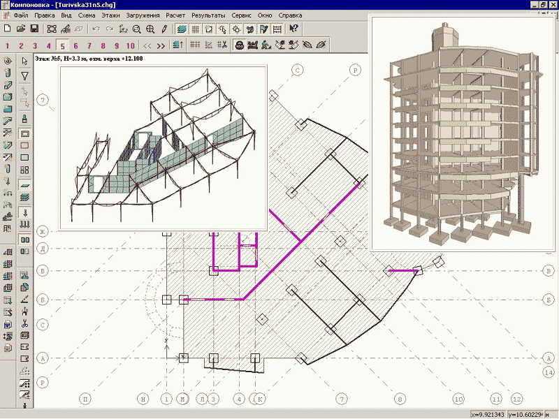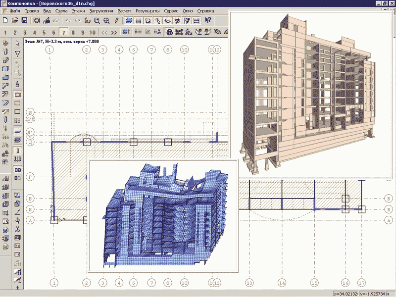 MONOMAKH software is intended for analysis and design of monolithic reinforced concrete structures and structures with brick walls. It is possible to perform analysis of the whole structure or its separate parts and generate working drawings and reinforcement patterns for structural elements.