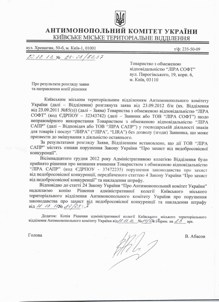 18 декабря 2012 года Административная коллегия Антимонопольного комитета Украины вынесла Решение: