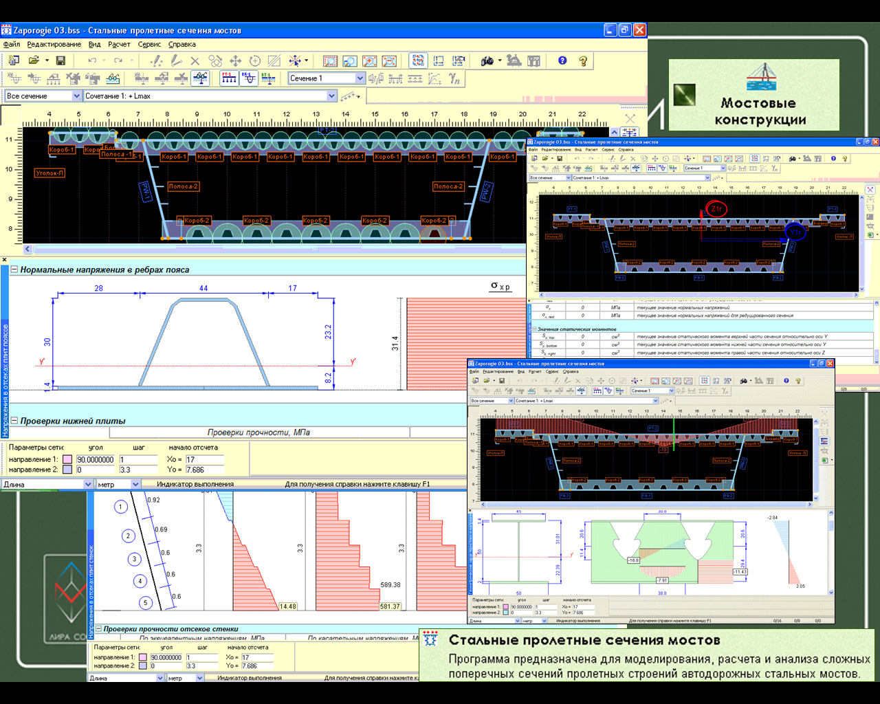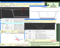 - Стальные пролетные сечения мостов. Программа предназначена для моделирования, расчета и анализа сложных поперечных сечений пролетных строений автодорожных стальных мостов. Фактическая неравномерность распределения нормальных напряжений по телу сложного сечения компенсируется возможностью введения коэффициентов редукции. В результате расчета выполняется декомпозиция модели поперечного сечения состоящей из ортотропных плит на элементарные стандартные расчетные объекты (отсеки стенок, участки плит между ребрами, отсеки поясов с ребрами, пластинки составляющие продольные ребра и т д.). Для каждого расчетного объекта, в зависимости от контекста и условий его работы в каждом сечении вдоль пролета, выполняется комплекс проверок прочности и местной устойчивости в соответствии со СНиП 2.05.03-84* "Мосты и трубы" с изменениями от 26 ноября 1991 г.