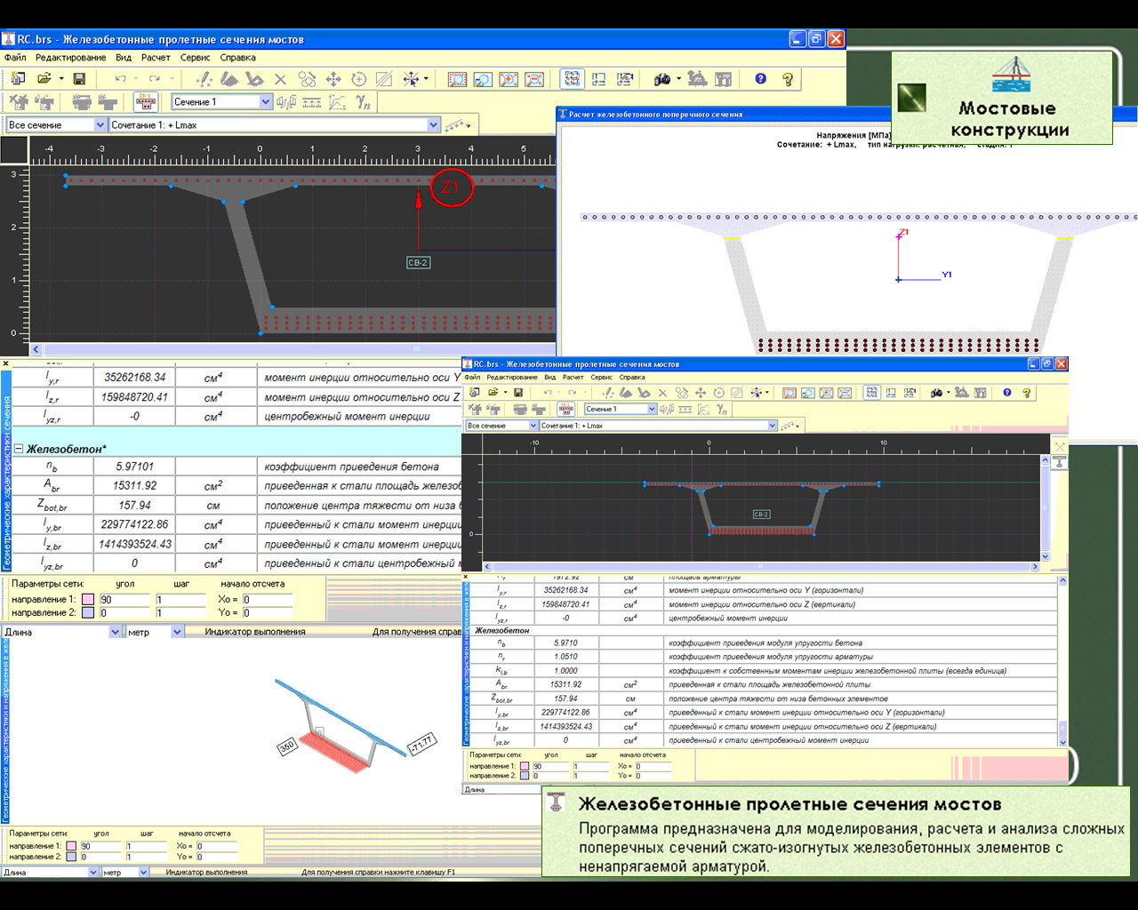 - Сталежелезобетонные пролетные сечения мостов. Программа предназначена для моделирования, расчета и анализа сложных поперечных сечений пролетных строений сталежелезобетонных мостов. Расчеты сталежелезобетонных пролетных строений отличаются повышенной сложностью, связанной со стадийностью работы. В отличии от формул приведенных в СНиП 2.05.03-84* "Мосты и трубы" с изменениями от 26 ноября 1991 г. добавлен учет внешней продольной силы. Кроме силовых внешних воздействий в программе учтены воздействия от усадки, разности температур и ползучести бетона, а также определяется минимальное количество анкеров для шва объединения железобетонной плиты со стальной частью конструкции.