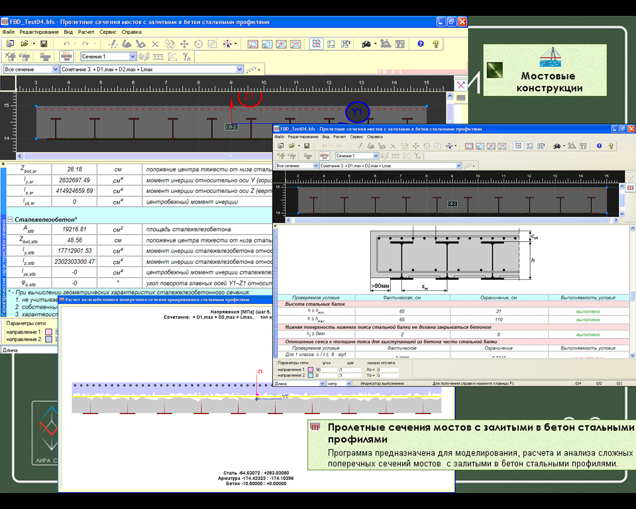 - Пролетные сечения мостов с залитыми в бетон стальными профилями. Программа предназначена для моделирования, расчета и анализа сложных поперечных сечений с залитыми в бетон стальными профилями Оригинальное название Filler beam deck – EN 1994-2:2005: E. Этот тип сечения в настоящее время используется для мостов, как на автомобильных, так и на железных дорогах. Указанная конструкция применяется для мостов под скоростные поезда в Германии и Франции. Для данных конструктивных решений характерна двухстадийная работа, которая учитывается в расчете. В результате расчета производится проверка сечений стальных балок и армирование железобетонной плиты. Учитывается усадка бетона.