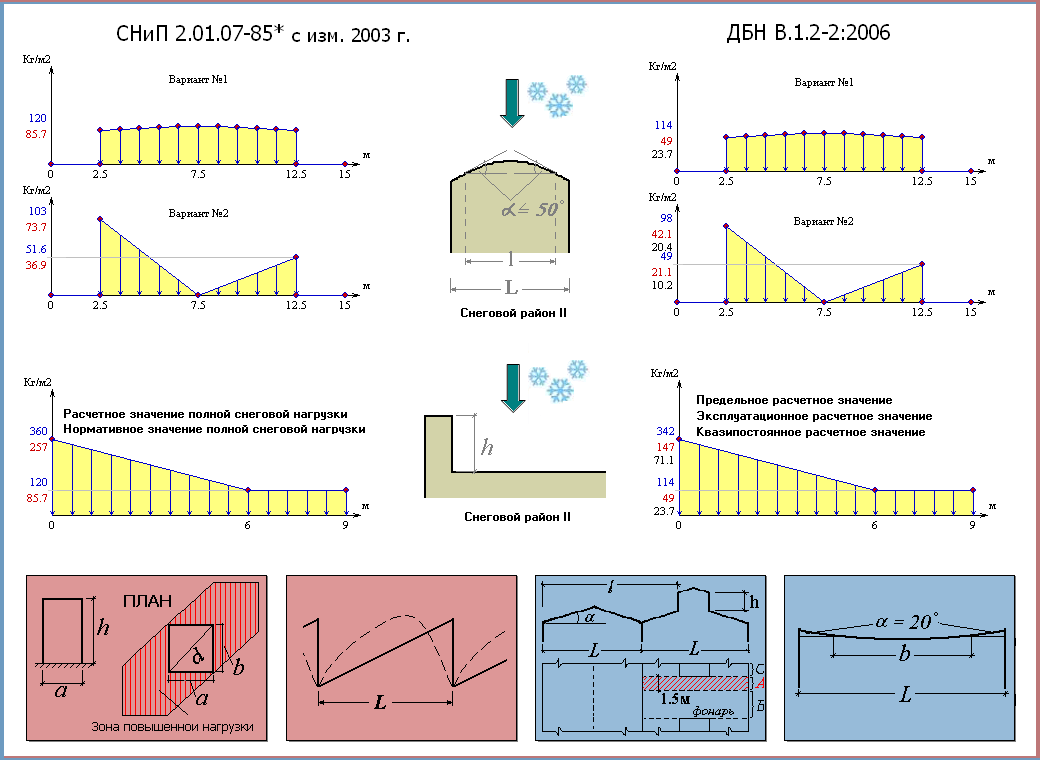 • В соответствии с СНиП 2.01.07-85* «Нагрузки и воздействия» вычисляются нормативные и расчетные значения полной снеговой нагрузки на горизонтальную проекцию покрытия по схемам таблицы 3 Приложения 3. • В соответствии с ДБН В.1.2-2:2006 «Нагрузки и воздействия» вычисляются предельные и эксплуатационные расчетные значения снеговой нагрузки на горизонтальную проекцию покрытия по схемам Приложения Ж.