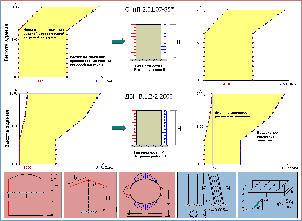 • В соответствии с СНиП 2.01.07-85* «Нагрузки и воздействия» вычисляются нормативные и расчетные значения средней составляющей ветровой нагрузки. Аэродинамический коэффициент определяется по схемам таблицы 4 Приложения 4. • В соответствии с ДБН В.1.2-2:2006 «Нагрузки и воздействия» вычисляются предельные и эксплуатационные расчетные значения ветровой нагрузки. Аэродинамический коэффициент определяется по схемам Приложения И.