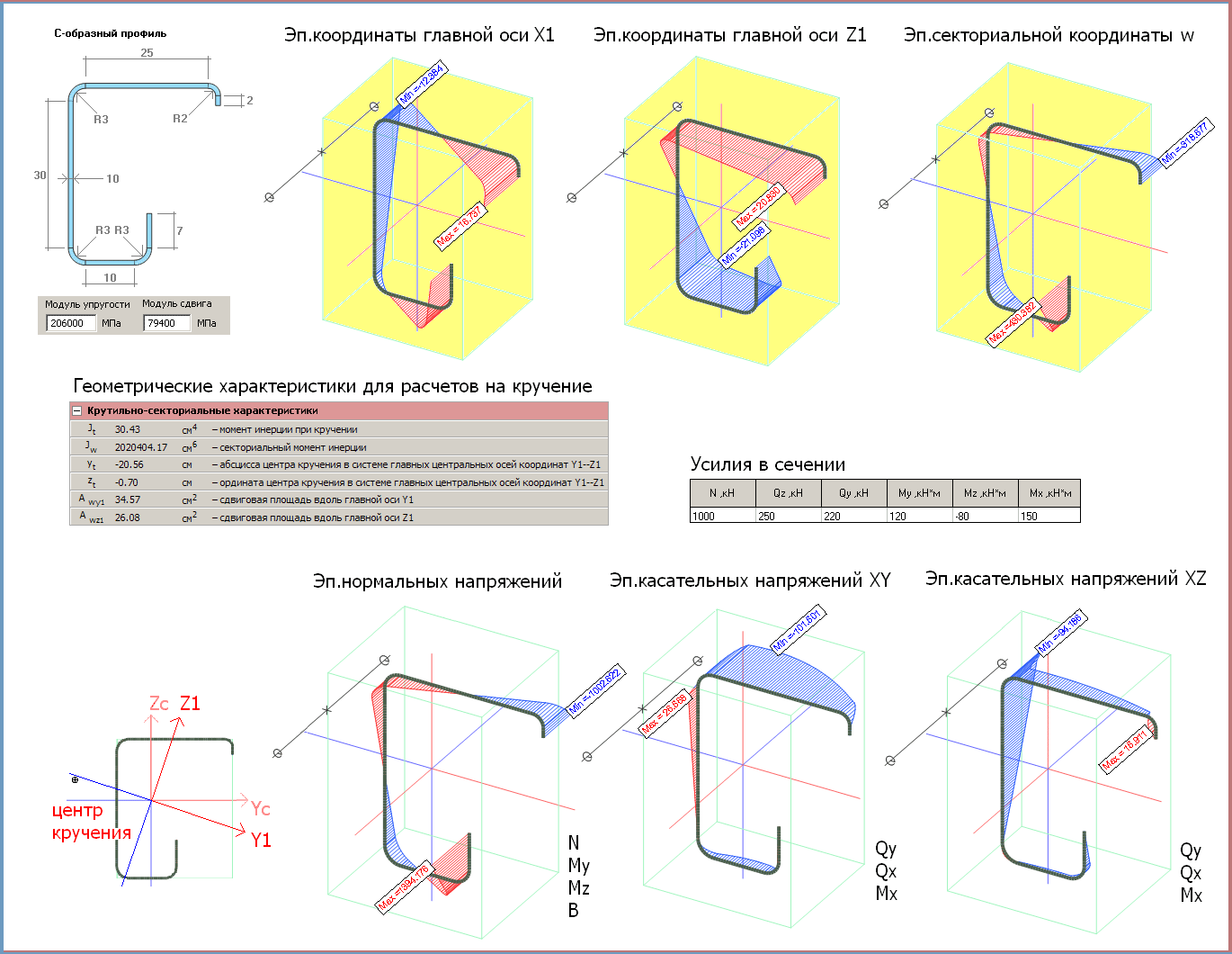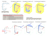 - Параметрические тонкостенные сечения Программа позволяет рассчитать геометрические характеристики для наиболее распространенных типов тонкостенных сечений. Кроме обычных геометрических характеристик определяются параметры, характерные для тонкостенного сечения: центр изгиба, центр кручения, сдвиговые площади, секториальный момент инерции, секториальные координаты.