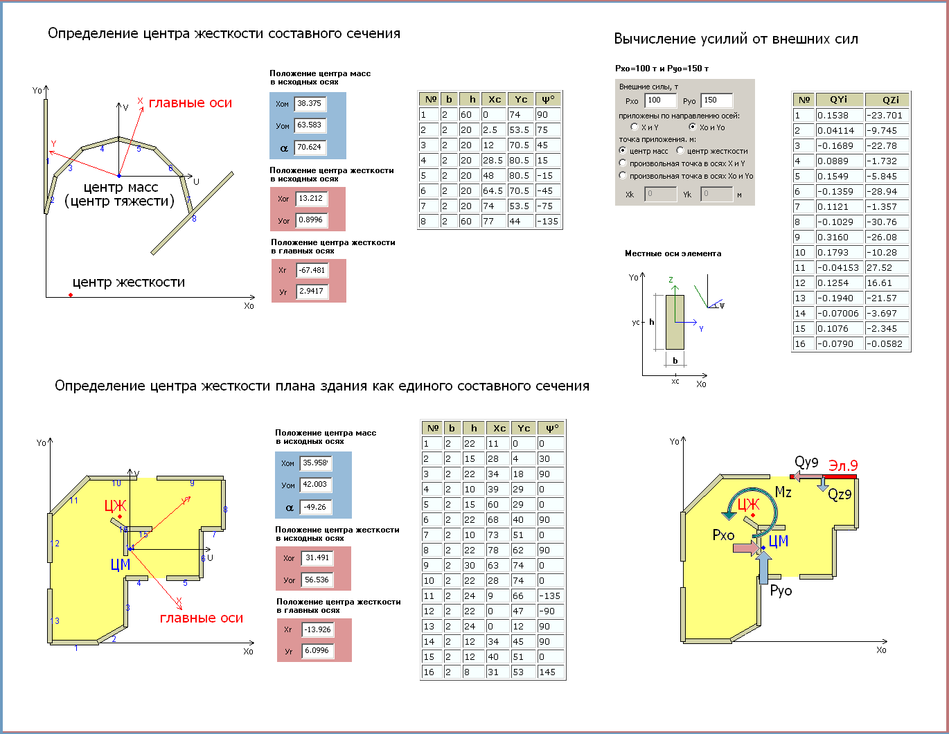 - Составные сечения Программа предназначена для определения центра жесткости составного сечения. С помощью этой программы можно вычислять центр жесткости плана здания как единого составного сечения. Определяются усилия в элементах сечения от действия внешних сил. Внешние силы могут быть приложены как в центре масс, так и в вычисленном центре жесткости, а также в точке с произвольными координатами. Внешние силы могут быть заданы в исходных или в главных осях. Привязки точки приложения также могут быть заданы в исходных или в главных осях.