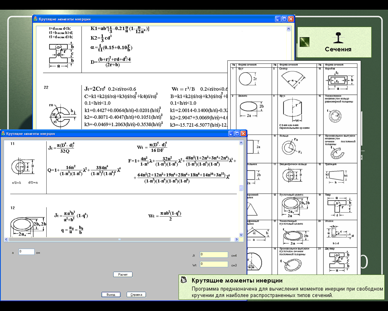- Крутящие моменты инерции Программа предназначена для вычисления моментов инерции при свободном кручении для наиболее распространенных типов сечений.