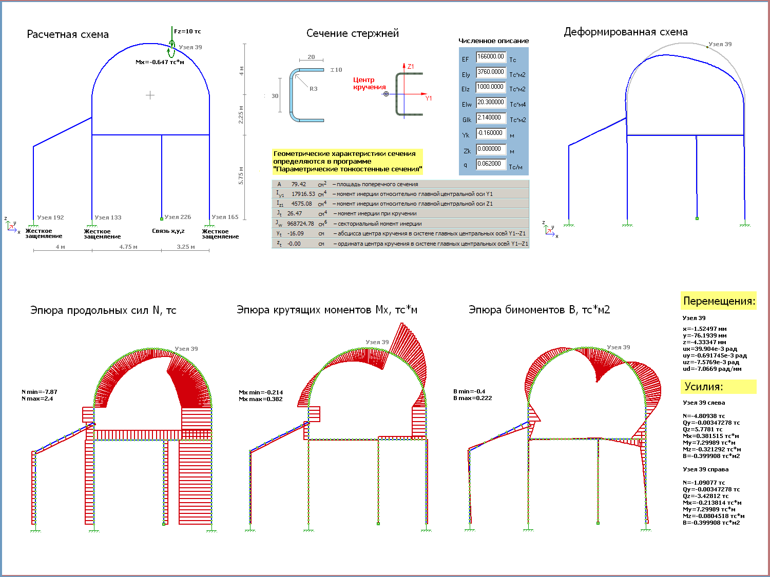 Тонкостенные стержневые системы Программа предназначена для статического расчета систем из тонкостенных стержней в условиях стесненного кручения. Каждый узел рамы имеет 7 степеней свободы – три линейных перемещения, три поворота и депланацию. В текущей версии реализован расчет плоских стержневых систем. Жесткостные геометрические и секториальные характеристики вычисляются автоматически при помощи программы «Параметрические тонкостенные сечения». Допускаются узловые нагрузки в виде сил, моментов, а также заданных перемещений и поворотов. Допускаются местные нагрузки. Принимается, что узловые нагрузки прилагаются в центре кручения (а не в центре тяжести), координаты которого являются одинаковыми для всех стержней, входящих в узел. В результате расчета вычисляются перемещения узлов, включая депланацию, и усилия в стержнях – продольная сила, изгибающие моменты, крутящий момент, перерезывающие силы, а также бимомент. Результаты расчета отображаются графически в виде деформированной схемы и эпюр усилий, а также выдаются в табличной форме.